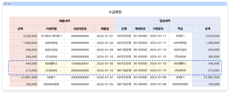 여러 은행계좌를 한번에 불러와 거래처의 수금체크를 간편하게 확인 할 수 있습니다.